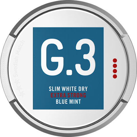 G.3 Blue Mint Slim White Dry – A mellow and spicy tobacco taste with distinct notes of peppermint and with hints of cedar and cocoa. A long and narrow full sized pouch that has a dry surface with a semidry content for a low salivation.