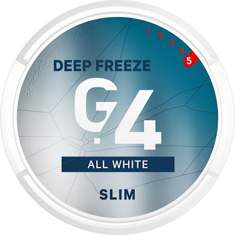 G.4 DEEP FREEZE All White Slim – A mellow and spicy character with distinct notes of eucalyptus and menthol. A long and narrow all white pouch with an optimized fit that has a dry surface with a moist content for low salivation and a long lasting release of flavour.