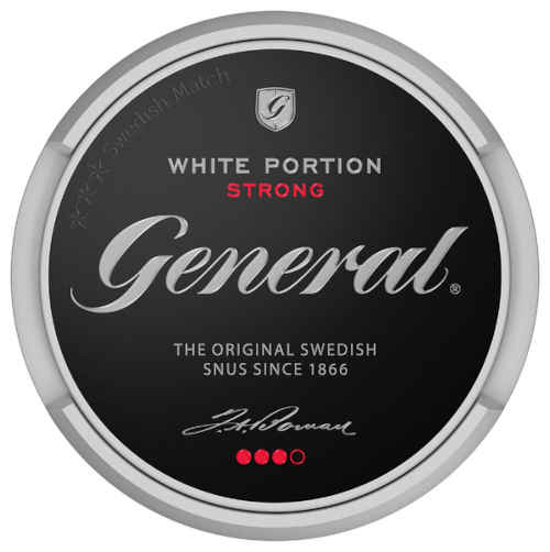 General Strong White Portion – The newest addition to the General collection, A spicy tobacco taste with notes of bergamot and hints of tea, hay and leather. There is 24 full sized pouches per can that is dry on the surface with a moist content for a low salivation and a lasting flavour release.