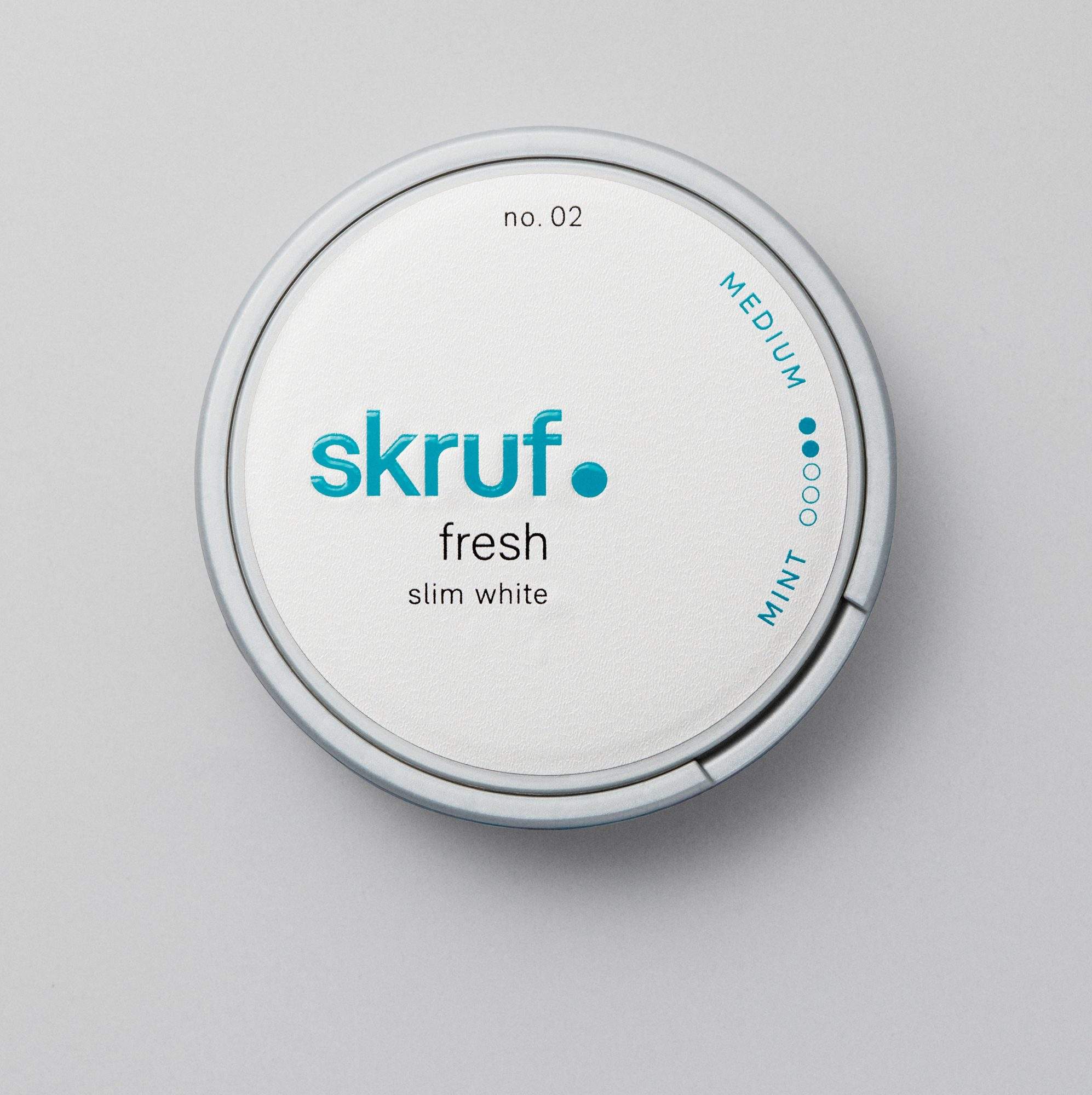 Skruf Slim Fresh White Portion no 2 Mint – offers a fresh snus that sit well under the lip with its slim, elongated shape. However, it has as much content as a regular prill and a clear taste of classic tobacco, spiced with mild spearmint.