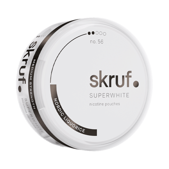 Skruf Super White no 56 Nordic Liquorice Medium Strenght – With a clear taste of nordic licorice and a hint of mint this pouch tastes like heaven under your lip. Normal nicotine level of 8 milligram per gram.