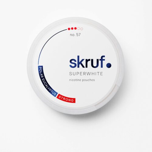 Skruf Super White no 57 Polar Eucalyptus Strong comes with an icy feeling and taste of menthol and eucalyptus.