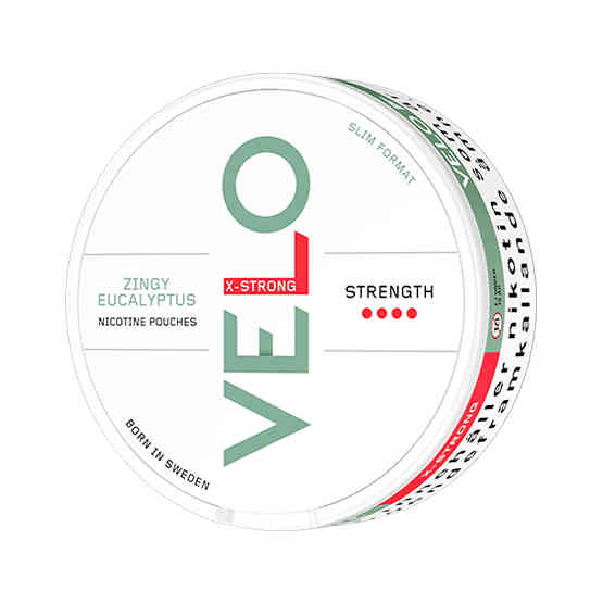 VELO Zingy Eucalyptus X-Strong – Experience the full flavour explosion of fresh eucalyptus. Feel how the senses are brought to life with every white portion. 0% tobacco – 100% enjoyment!